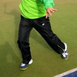 利き腕と同じ足を横に滑らせ、体が前を向いている状態でスイングする。